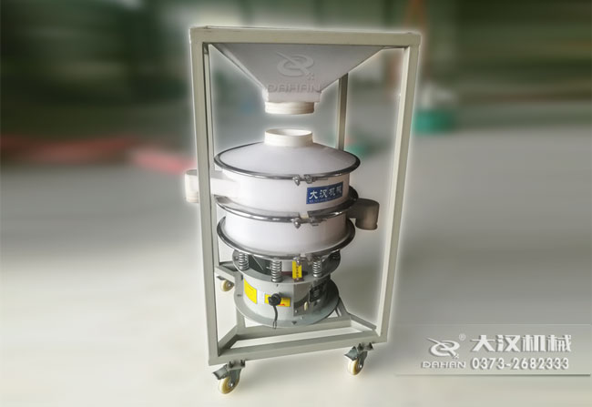 本品大漢公司研制的移動式料倉篩粉機,底部加裝可移動式萬向輪,帶進料倉,可將物料一次性裝滿料倉,然后通過調節(jié)料倉上的蝶閥控制物流進入振動篩的流量進行篩分,本品的特點間歇性加料,不用工人不間斷投料節(jié)省人工,蝶閥控制流量大小能提高篩分精度,同時可將振動篩移動作業(yè),滿足不同地點的工作需要。